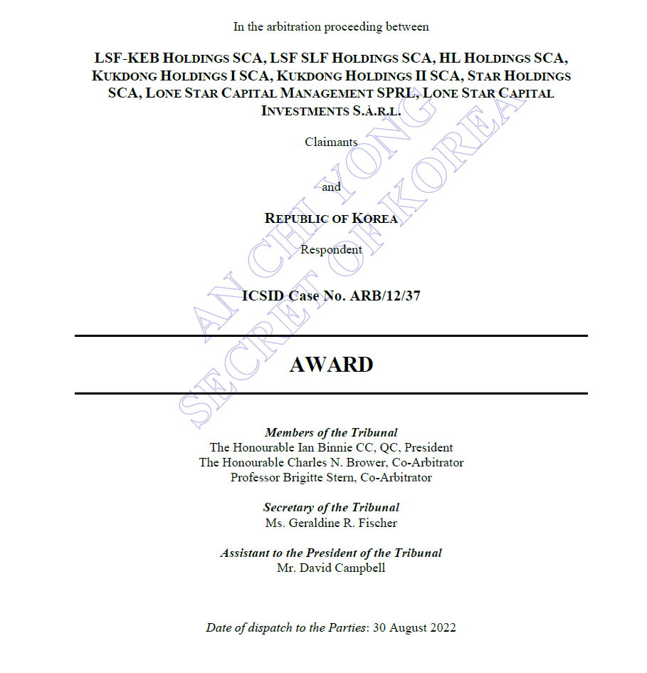 국제투자분쟁해결센터가 지난해 8월 30일 한국정부가 론스타에 약 2억1650만달러를 배상하라고 판정한 것과 관련, 해당판정문의 무삭제 원문을 공개합니다.