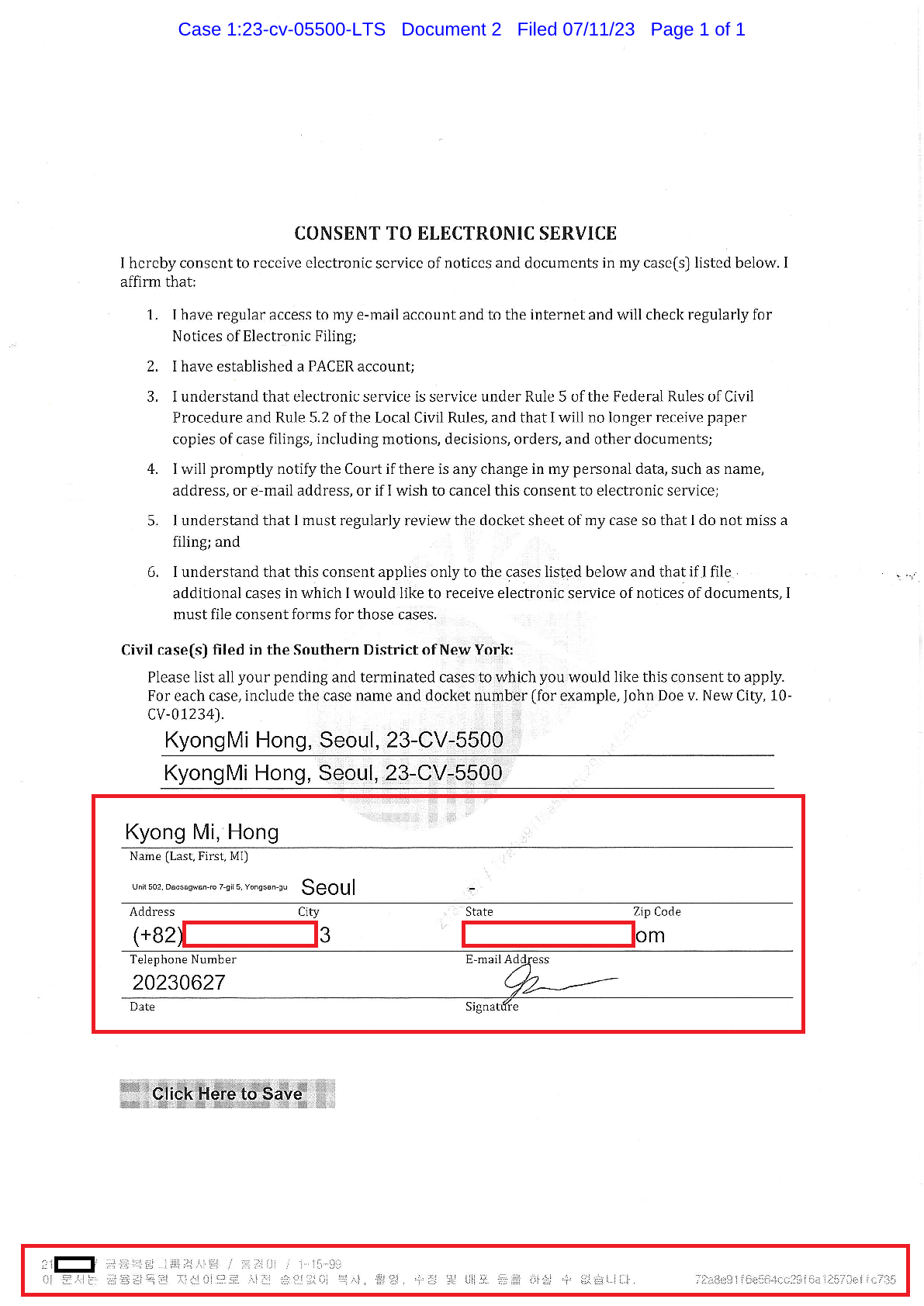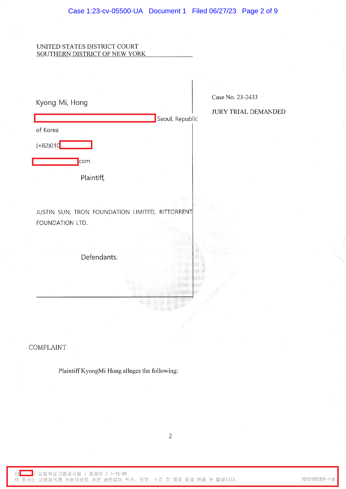 금감원직원 기강해이 놀랄노자 – ‘빼도박도 못하는 기강해이증거, 엉뚱하게도 미 연방법원서 들통 – 가상화폐사기 연방 법원 소송장 보니 금감원 컴퓨터서 출력 – 개인 소송장에 ‘금감원 로고’ 워터마크 – ‘이문서 는 금감원자산입니다’ 경고문구는 금감원전산망사용 입증 - 소송원고 홍경미와 동일이름의 인물, 문서에 적힌 금감원 부서 근무 – 소송원고, ‘금감원직원이냐’본보 질문에 답변않고 엄포 – 정부부처 및 공기업 및 공공기관 전면 보안전점 절실 - 뉴욕남부연방 법원[사건번호 SDNY – 1:23-CV-5500-UA] https://buly.kr/Csfxw33