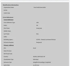 자유북한방송 썸네일형 리스트형 자유북한방송, 지난 5월 미국무부 배제대상[EPLS]으로 지정 - 향후 3년간 기금신청못해 북한전문매체 '자유북한방송'이 지난 5월 미 국무부에 의해 거래배제대상으로 지정된 것으로 확인됐습니다. 미 국무부에 따르면 국무부내 '재정원조담당부서'가 자유북한방송[FREE NORTH KOREA RADIO]를 지난 5월 18일부터 2015년 5월 17일까지 향후 3년간 미국과의 거래배제대상으로 지정했다고 밝혔습니다. 국무부는 자유북한방송이 서울 강서구 가양동 130-1번지에 소재하며 우편번호가 157-801 이라고 밝혀 정확히 자유북한방송의 주소와 일치했습니다. 또 관련인물이 김성민 이라고 밝혀 자유북한방송의 대표 김성민씨와 일치했습니다. 자유북한방송이 국무부의 제재를 받은 이유는 알려지지 않고 있으나 국무부내 '재정원조담당부서'가 자유북한방송제재의 주무부서라고 기록된 것으로 미뤄 북한 인권법에 따른 .. 더보기 북한 여대생, 유투브에 삐라 뿌리다 - 우리집 자랑 ㅋ 북한 꽃제비 REALITY OF NORTH KOREA 1-5 [영어더빙 동영상] http://andocu.tistory.com/1667 動画]北朝鮮 實態 http://andocu.tistory.com/1667 북한도 HP노트북에 MS 워드 보편화 ? - 북한여대생 안습 동영상 http://andocu.tistory.com/1993 김정남 마카오 인터뷰 동영상 - 2008, 2009 http://andocu.tistory.com/1990 김일성 육성 동영상보기 - 이때까지 제재안받은 적 없다 http://andocu.tistory.com/1981 미 국무부, 북한관련단체에 기금지원 - 북한단체 적극적 기금신청 절실 http://andocu.tistory.com/1967 북한 여대생, 유투브에 삐라 뿌리다 .. 더보기 김일성 육성 동영상보기 - 이때까지 제재안받은 적 없다 미 국무부, 북한관련단체에 기금지원 - 북한단체 적극적 기금신청 절실 http://andocu.tistory.com/1967 북한 여대생, 유투브에 삐라 뿌리다 - 우리집 자랑 ㅋ http://andocu.tistory.com/1988 더보기 이전 1 다음