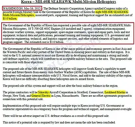 MH-60R SEAHAWK 썸네일형 리스트형 시호크헬기 미국은 1대당 4천만불 VS 한국은 1대당 1억2천5백만불 : 2013년 미국방예산 원문첨부 2012/05/23 - [분류 전체보기] - 무기구매 14조 어림없다-미국요구대로라면 최소 24조 소요: MB정부, 축소 의혹? 2012/05/24 - [분류 전체보기] - 25년전 삼성이 소송한 책보니 '이병철 혼외 딸 있다' - 그렇다면 리제트 리, '나는 이병철 외손녀' 사실? 한국정부가 10억달러에 시호크헬기 8대 도입을 추진중인 가운데 미국방부는 2013회계연도에 미해군이 시호크헬기 19대를 8억4천3백만달러에 구매할 계획인 것으로 확인됐습니다 미 국방부가 지난 2월 미의회에 제출한 국방예산안중 시호크헬기[MH-60R] 구매예산을 확인한 결과 미 해군이 2013회계연도에 시호크헬기 19대를 구매하며 이에 소요되는 예산은 8억4천3백만달러로 책정, 보고한 것으로 드러났습니다 [스패어및 수리부품 비.. 더보기 이명박정부, 미국에 시호크 8대등 10억달러에 주문- 당초정부발표의 2배 2012/05/22 - [분류 전체보기] - 시호크헬기 미국은 1대당 4천만불 VS 한국은 1대당 1억2천5백만불 : 2013년 미국방예산 원문첨부 2012/05/24 - [분류 전체보기] - 25년전 삼성이 소송한 책보니 '이병철 혼외 딸 있다' - 그렇다면 리제트 리, '나는 이병철 외손녀' 사실? 이명박정부가 임기 마지막해인 올해 14조원의 무기구입을 추진중인 가운데 지난 16일 미국정부가 한국정부에 시호크 헬리콥터 8대를 10억달러에 판매한다며 미의회의 승인을 요청한 것으로 확인됐습니다 이같은 액수는 이명박정부가 해상작전헬기도입을 위해 책정한 예상금액 5,538억원의 2배를 넘는 액수로서 전체 무기도입액이 당초 14조원보다 훨씬 더 늘어날 가능성을 보여주고 있습니다 미 국방부산하 국방안보협력처는 .. 더보기 이전 1 다음