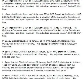 sofa 썸네일형 리스트형 지난해 한국법원 유죄선고 주한미군범죄자 98.5% 석방 - 2명만 실형 지난해 범죄행위로 한국법원에서 유죄를 선고받은 주한미군범죄자 1백29명중 실형을 선고받은 미군은 단 2명으로 전체 유죄선고자의 1.6%에 그쳐 솜방망이처벌이라는 의혹이 일고 있습니다 주한미군사령부가 매달 자체 웹사이트[http://www.usfk.mil/usfk/default.aspx]에 게재하고 있는 한국법원 주한미군범죄자 선고현황을 분석한 결과 지난해 강도,폭행등 각종 범죄를 저질러 서울지방법원등에 재판이 회부된 주한미군은 모두 1백30명이었으며 이중 무죄가 선고된 1명을 제외하고 1백29명에게 유죄가 선고됐습니다 그러나 한국법원에서 유죄가 선고된 주한미군범죄자중 실형을 선고받은 사람은 단 2명뿐이었습니다 의정부지방법원이 지난해 11월 30일 재물파괴, 절도, 무면허음주운전 그리고 사실상의 강간혐의로.. 더보기 '계엄령-위수령땐 SOFA 효력 즉각 정지(?)' - 하야리야부대 대테러 방어계획 원문 부산의 미군부대인 하야리야부대는 한미양국의 합의에 따라 올해말까지 반환되고 그 자리에는 시민공원들이 들어설 것으로 알려지고 있습니다 지난 2001년 미국 국방부는 이 하야리야 부대에 대한 테러등에 대비한 방어계획을 작성했었습니다 제가 입수한 하야리야부대 테러대비 방어계획은 백13페이지짜리이지만 출처가 알려지는 것을 막기 위해 앞부분 15페이지를 삭제했다 합니다 이 보고서에는 테러잠재세력을 테러집단, 북한, 학생단체, 시민단체등으로 규정하고 있으며 미군부두로 잘 알려진 8부두 방어계획등도 포함돼 있습니다 미군은 이 계획에서 부산지역등에 대한 테러징후에 따라 5단계 계획을 수립했던 것으로 확인됐습니다 THREAT CONDITION 에 따라 THREATCON 노말에서 알파, 브라보, 찰리, 델타까지 5단계 T.. 더보기 이전 1 다음